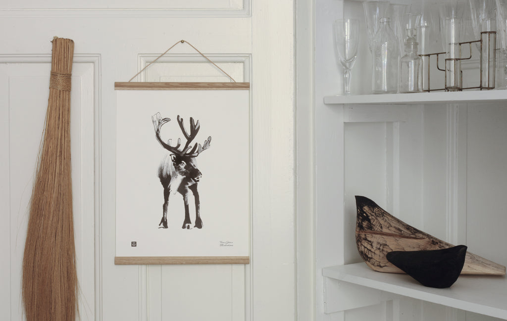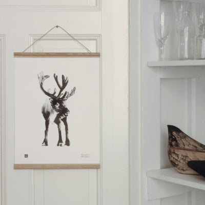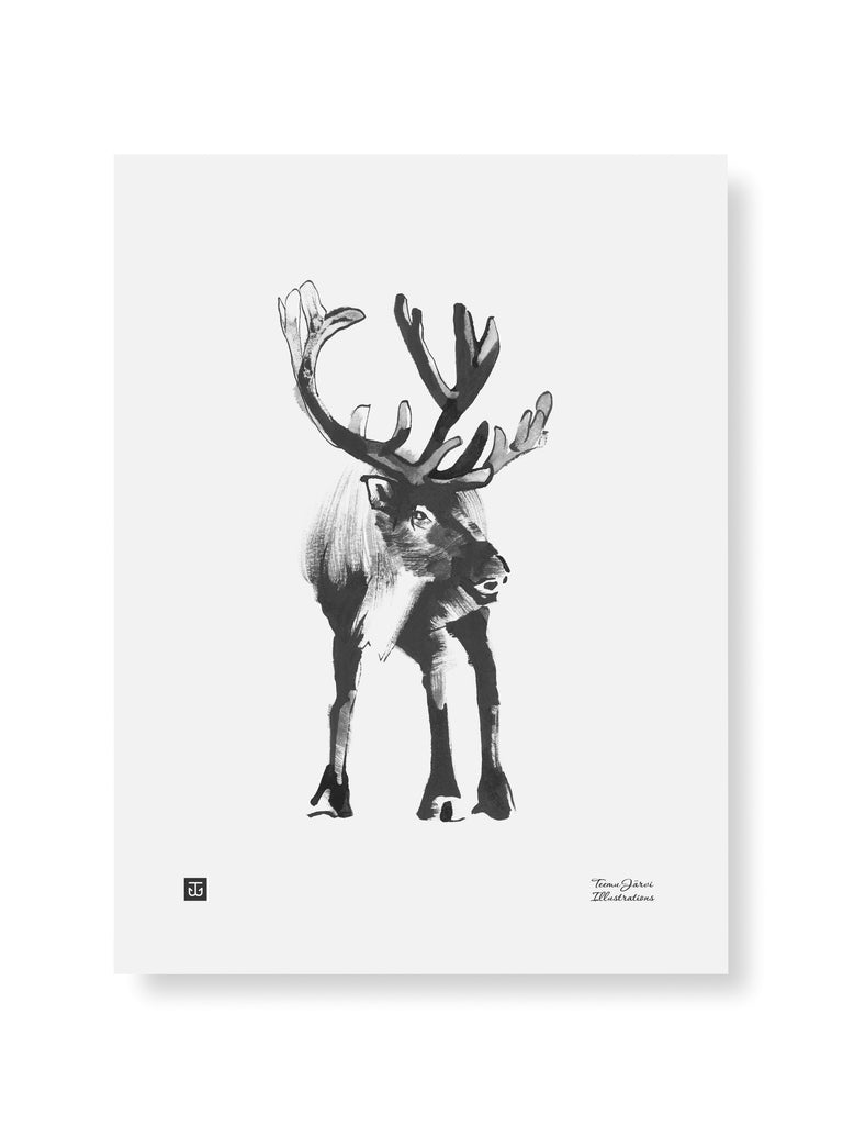 The Reindeer wall art print features a male reindeer with handsome antlers.