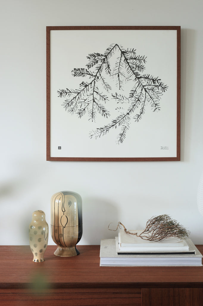 Spruce, the magnificent tree of the woods. The original Spruce branch wall art was inspired by an ancient Asian printing method know as ‘gyotaku’. In this method ink is applied directly on the natural subject, which is then rubbed on or pressed against paper to create the picture. The method captures fishes and plants extremely delicately, repeating even the tiniest little details such as fish scales, and stems and veins of a plant.