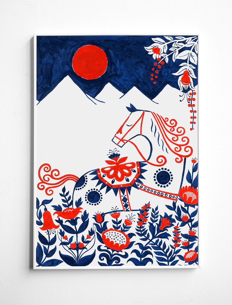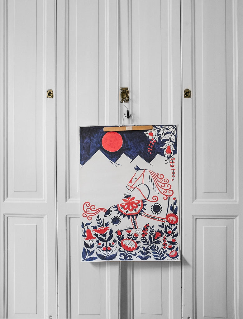 A super sweet poster with motif of the Swedish Dala horse by artist and illustrator Henning Trollback.