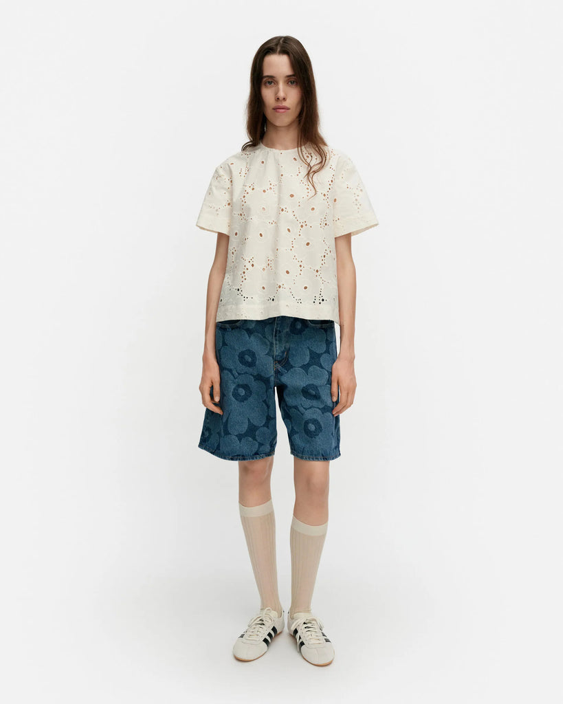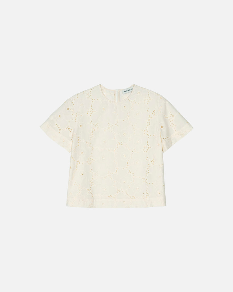 The Alustus blouse has a relaxed, A-line fit and it features the broderie anglaise Unikko pattern. The blouse has an O-neck with a concealed zipper in the back seam, and short loose sleeves.
