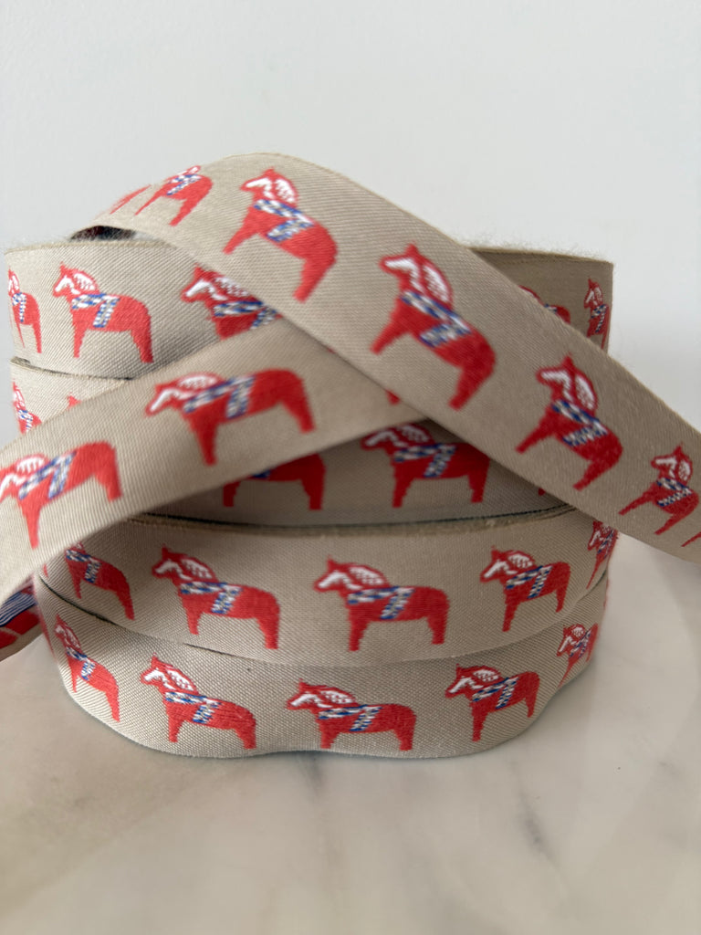 The Swedish Dala Horse is featured on this ribbon made in Sweden